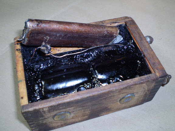 On arrival, all coils are tested to ascertain whether the capacitor is within tolerance and the output tested on the Strobo-spark. Coil windings are also tested at this stage. If the capacitor is found to be borderline or leaking it is replaced with a new high quality component. This necessitates digging out the original component which is potted in pitch within the wooden case. The pictures below show the original capacitor and its location within the wooden casing. The second picture shows the modern replacement. We have found many types of replacement component fitted to coils but none are to the specification of these. Once the new capacitor has been fitted, the original glass/wood insulator is refitted and pitch is melted and topped back up to the correct level before the cover is replaced. All hardware is cleaned and inspected prior to refitting or replacing as required. The outer case is given a clean and the top repainted in satin black as per original. Linseed oil is applied to freshen up the appearance and protect the wood. The coil is then re-tested using the Strobo-spark and the points correctly set to give the optimum output.